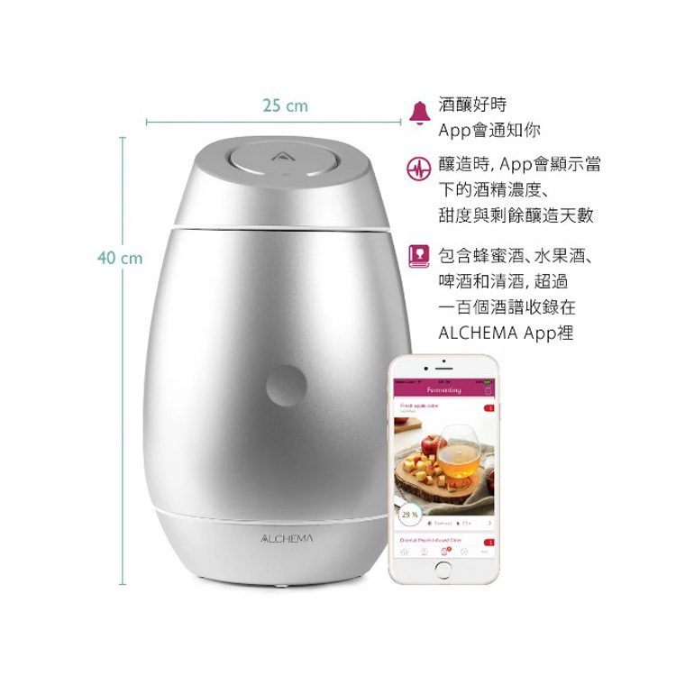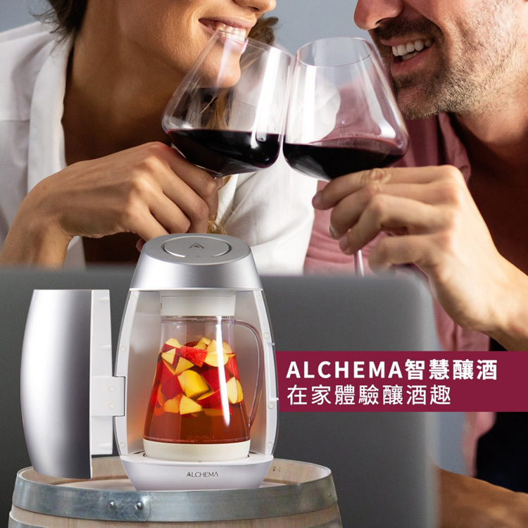 ALCHEMA 智慧釀酒機輕鬆DIY各種發酵酒,例如梅酒、清酒、葡萄酒、啤酒、蜂蜜酒,搭配App,一步步引導整個流 程,完成釀酒自動通知。也可將你獨創的風味酒譜,分享給大家。