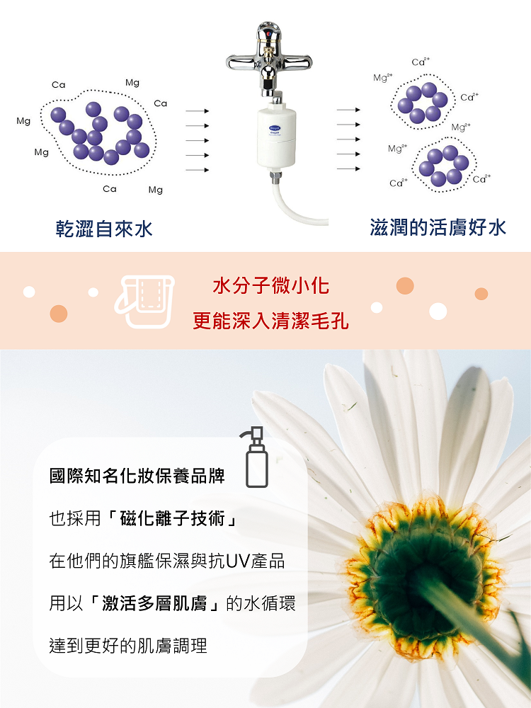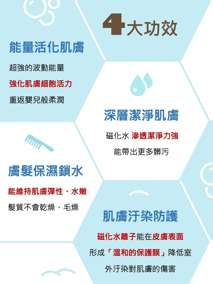 『磁化水離子』獨家專利技術,增加水中離子11倍,激活肌膚保濕循環,讓肌膚更美更健康
