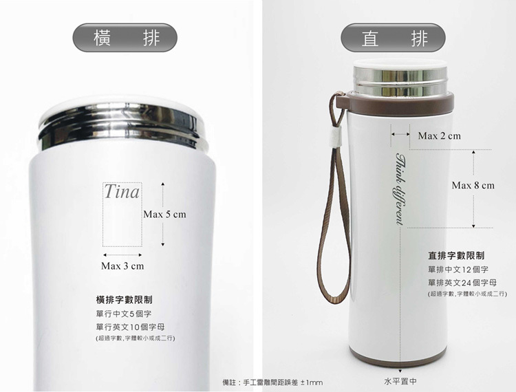 • 保溫杯若接近金屬色,刻字跟底色系較相近。