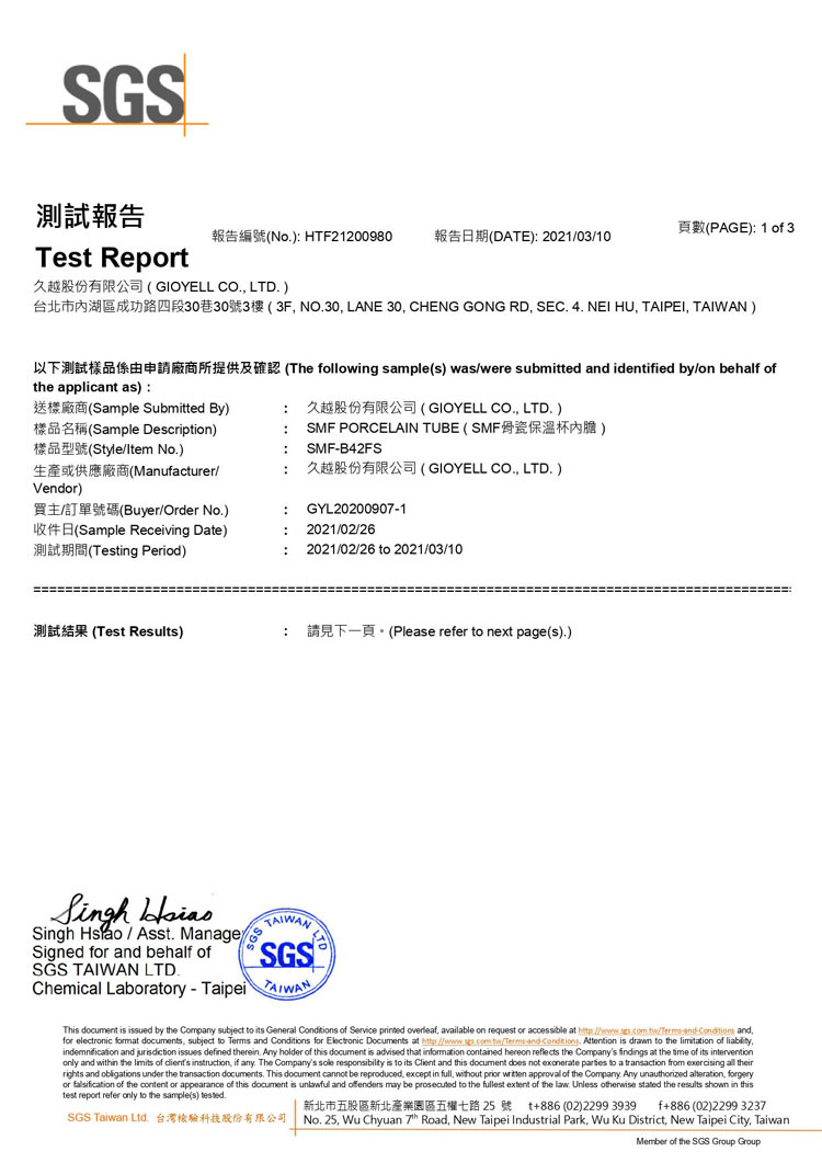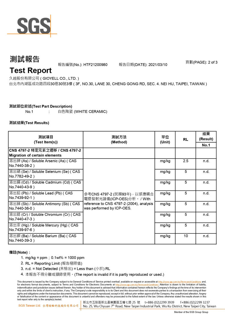 台灣SGS檢驗,骨瓷內膽不含鉛鎘鉻砷汞鋇等8大重金屬,檢驗報告編號 HTF21200980