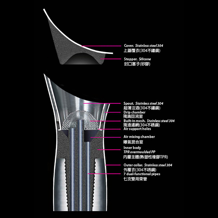 四個核心功能:醒酒、倒酒、酒瓶塞、濾渣網,